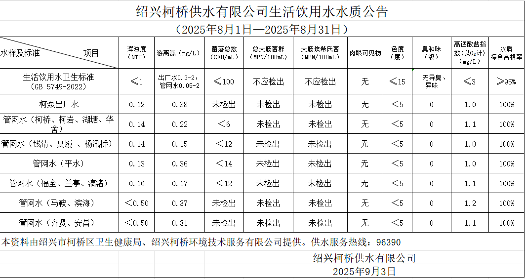 生活飲用水水質(zhì)公告(2025年8月1日—2025年8月31日)