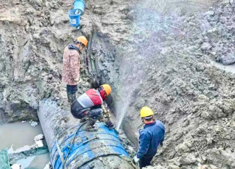 經現場緊急排查,確定為一根直徑20厘米的供水管道發生破裂。搶修人員不顧嚴寒,迅速制定方案、調度設備。戶外溫度逼近冰點,作業坑內積水寒冷刺骨,搶修人員卻毫不猶豫跳入坑中,在泥水交加的狹小空間里展開搶修。經過連續幾個小時的緊張作業,破裂管道于下午2:00被成功修復,供水恢復通暢。