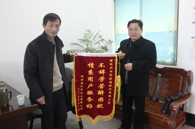 11月30日,紹興江華化工有限公司負(fù)責(zé)人來到公司,送來 “不辭辛勞解困擾,情系用戶服務(wù)好”的錦旗,對(duì)濱海供水公司長(zhǎng)期以來為企業(yè)解決難題,營(yíng)造良好的供水環(huán)境,提供高效的服務(wù)支持過程中表現(xiàn)出來的管理高水平、人員高素質(zhì)、工作高效率表示深深感謝。